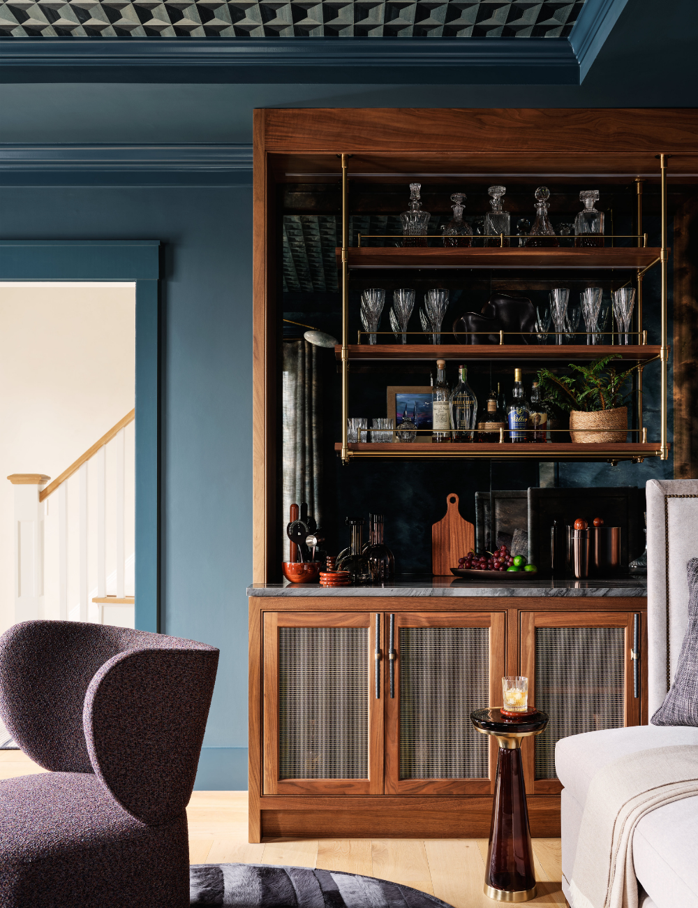 The home’s layout provided a strong canvas for our design, which aimed to create a harmonious, non-competing aesthetic that seamlessly transitions from the interiors to the outdoor space. Partnering with Sweenor Builders, we balanced comfort with thoughtfully considered design elements, creating an inviting space perfectly positioned to welcome family and friends. These clients love to entertain, so we incorporated storage and custom pieces, such as an integrated fireplace and media wall, banquette seating, and a built-in bar, to enhance functionality while maintaining ease and interest for get-togethers, big and small.