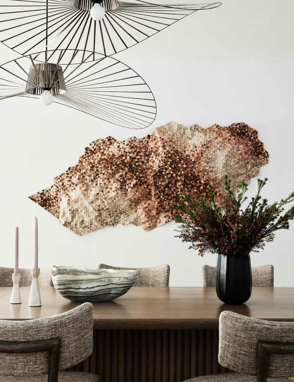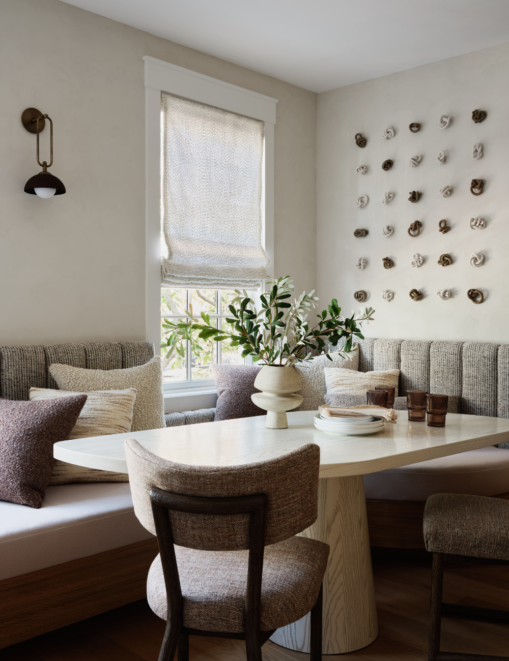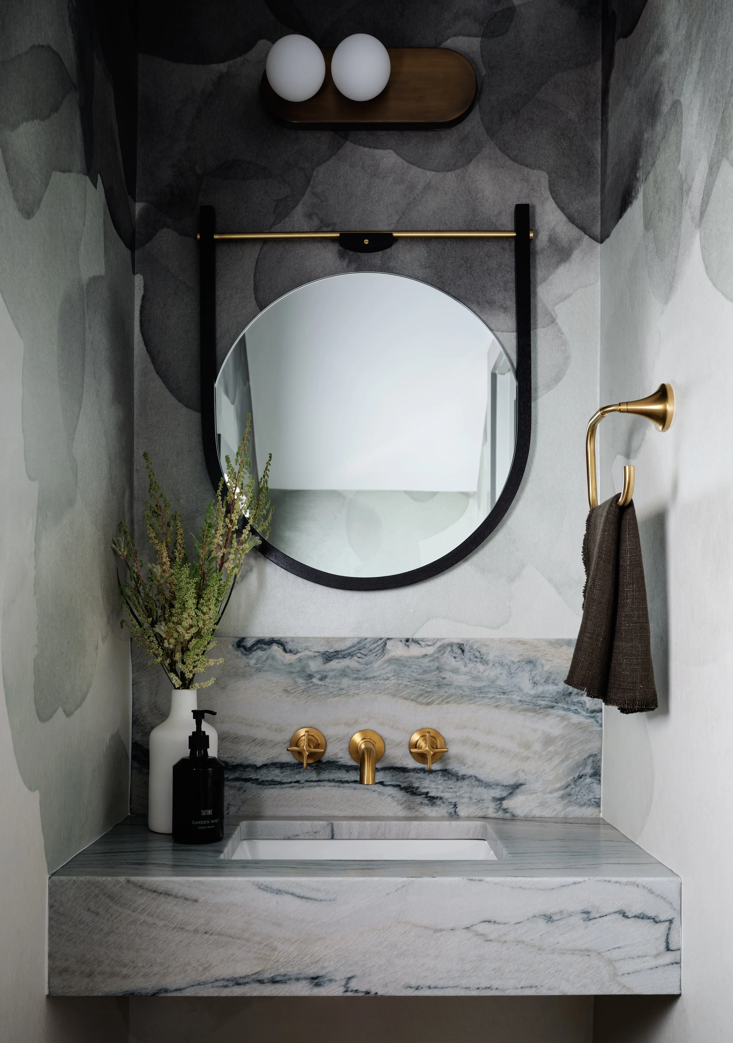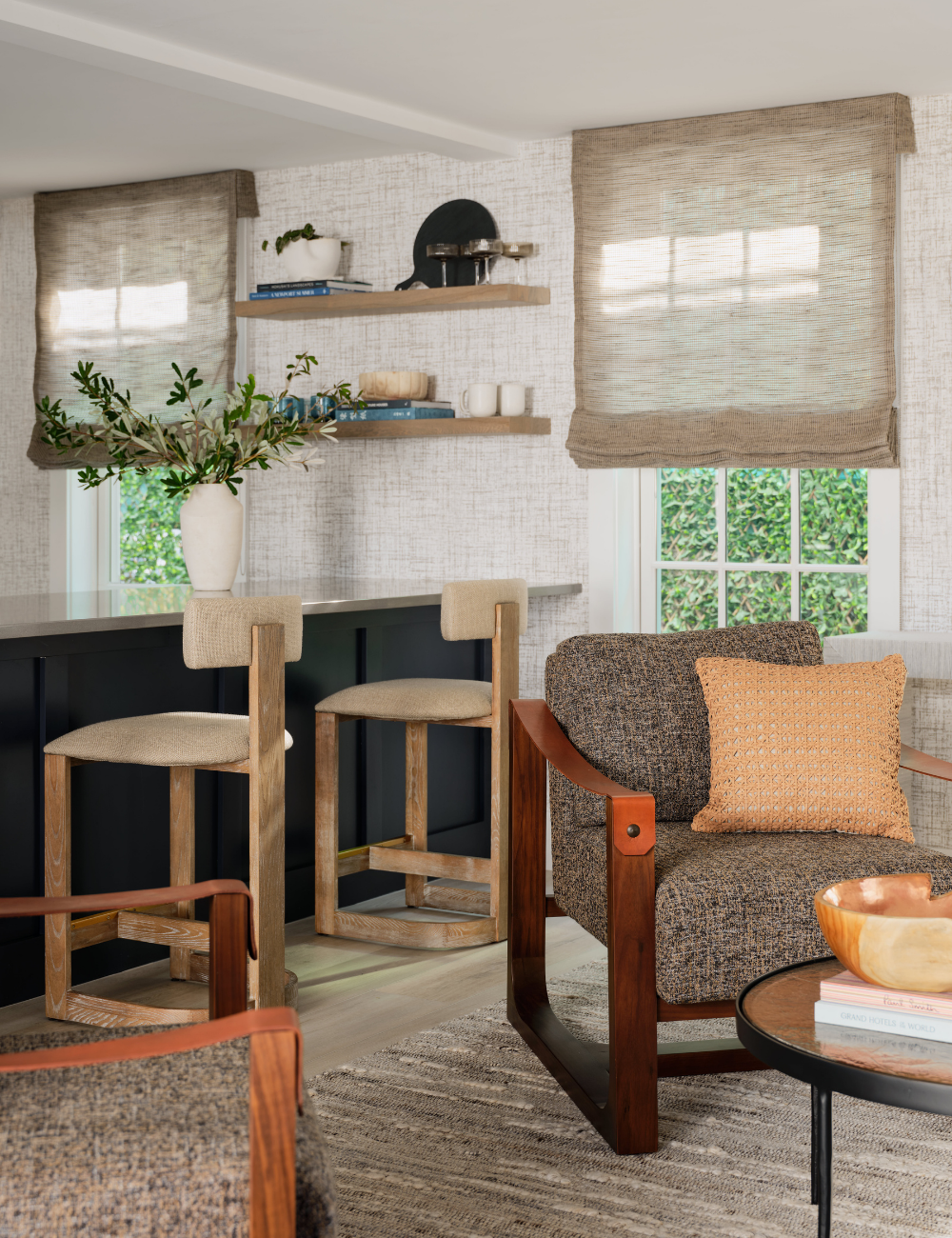 The overall design focused on a neutral, layered palette, emphasizing natural materials, texture, and warmth. Wallcoverings and accent pieces create depth and character, while statement lighting balances the home’s high ceilings and draws the eye upward upon entry. This understated color scheme gave way to subtle yet sophisticated accents that honor the home’s unique architectural features. Original artwork, curated from local artists, adds contrast and a distinct sense of place.